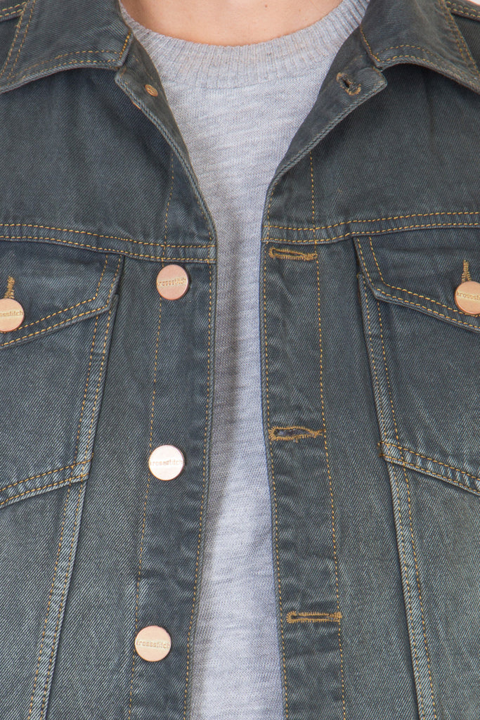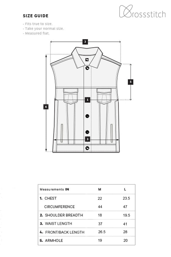 - Pattern & Fit - Regular fit non-stretchable denim jacket with KROSSSTITCH logo embossed brass button enclosure, double patch pockets with flaps and brass buttons at front, cut & sew detailing and two welt pockets at front and waistband at bottom hem with two side loops at back.