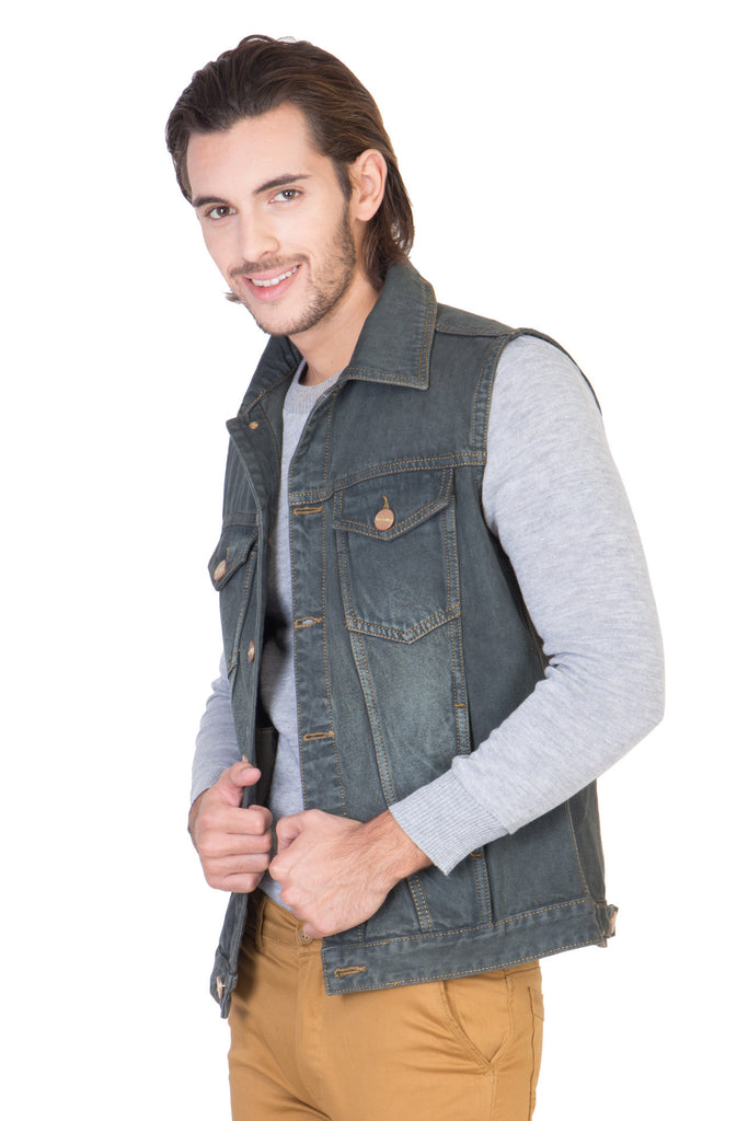 Sleeveless Grey Men's Denim Jacket with Brass Button